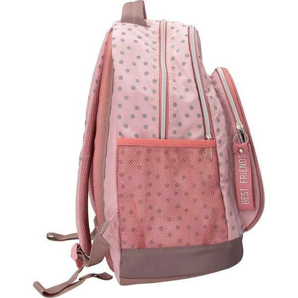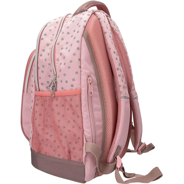TOPModel Sac à dos scolaire DOTSCe sac à dos scolaire TOPModel rose à pois gris attire tous les regards et est en plus très pratique : il dispose de poches latérales et d’une poche avant permettant un accès rapide. Sa poignée est matelassée, l’intérieur séduit par ses deux compartiments spacieux. Les bretelles sont réglables. Matière : 100 % polyester.