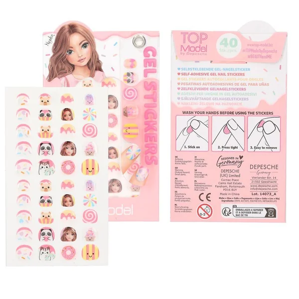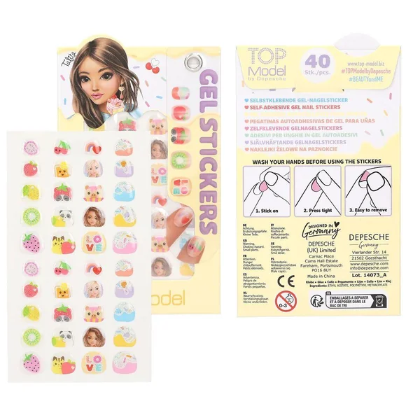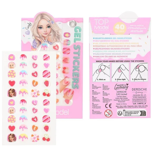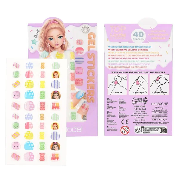 TOPModelStickers gel pour ongles CANDY GLAMLes autocollants pour ongles autoadhésifs de TOPModel te permettent de créer du nail art super cool en un clin d’œil. 40 autocollants pour ongles de différentes tailles par set, certains avec des finitions fluo ou pailletées. Quatre sets cool sont disponibles, tous avec des motifs culinaires. Miam !