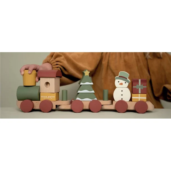 Monte à bord du train de Noël ! À l’aide des blocs à empiler de différentes formes, construis le sapin de Noël dans le wagon. Le train à empiler stimule la coordination main-yeux de votre enfant et soutient la motricité fine.