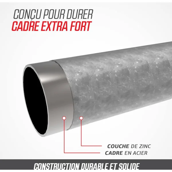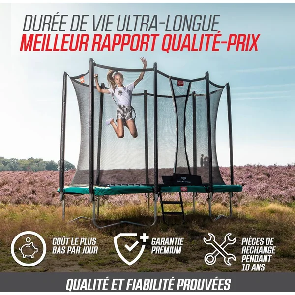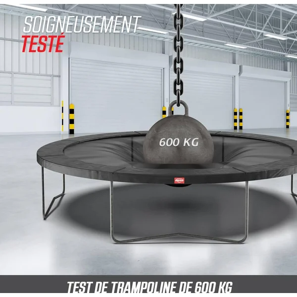 Tous ces sauts ne vous lassent jamais? Aucun problème! Le BERG Favorit vous procure des années de plaisir, s’use à peine et nécessite peu d’entretien. Le BERG Favorit a été conçu avec beaucoup de soin et d’attention. Le résultat en vaut la peine; c’est un trampoline d’excellente qualité et très sûr.Toile de saut. Tapis de saut durable en propylène tissé très résistant. Les boucles de ces robustes trous métalliques des ressorts sont solidement fixées avec 8 séries de coutures. Grâce à la structure à mailles ouverte, le tapis de saut ne se réchauffe pas et ne brûle pas les pieds.Goldspring Solo Les trampolines de toutes les tailles de la ligne Favorit sont équipés de ces ressorts. C’est pourquoi on rebondit si confortablement sur ces trampolines. Le confort de saut sur ces trampolines est beaucoup plus élevé que sur la précédente ligne de BERG Talent avec ressorts GoldSpring Talent.BERG RegularSi vous ne voulez pas creuser de trou dans le jardin, il est préférable de choisir un trampoline haut. Un trampoline haut est très facile à installer et à changer de place. En outre, un trampoline haut se voit bien dans le jardin.Un trampoline rondLe cadre d’un trampoline rond est très solide. Quand on rebondit sur un trampoline rond, on revient toujours vers le milieu. C’est au milieu d’un trampoline rond que l’on rebondit le plus agréablement. La raison en est la suivante: c’est au milieu que les ressorts et le cadre répartissent mieux les forces du saut.