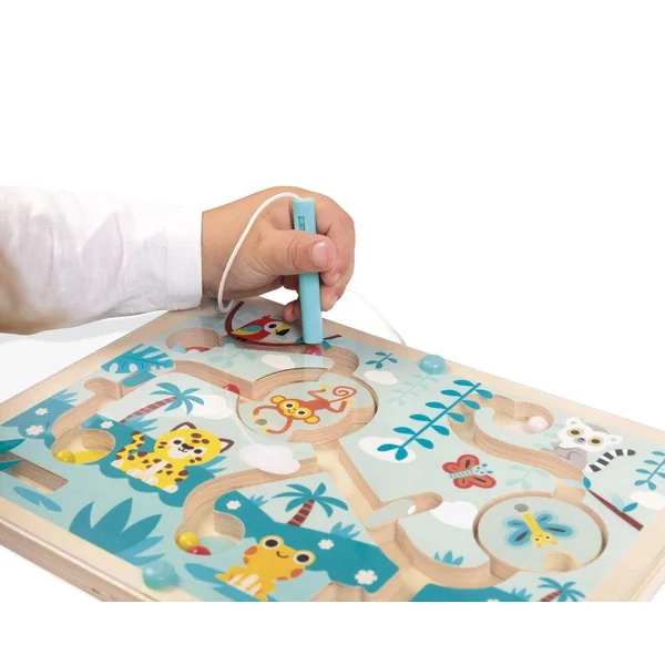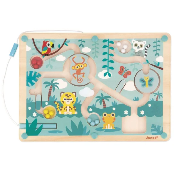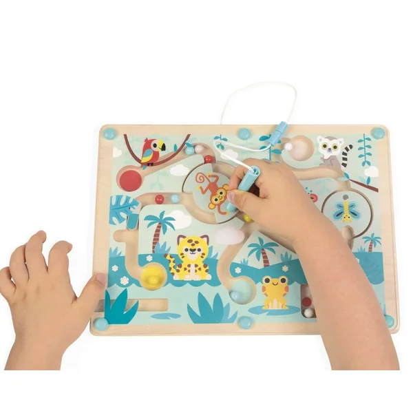 Bienvenue dans la jungle ! Un endroit où fourmillent les animaux exotiques. Votre enfant devra traverser le labyrinthe pour distribuer les 12 billes colorées au bon animal, grâce au stylet magnétique. Attention aux embuches ! Il faut utiliser le tourniquet pour échapper au singe et au papillon. Développe la dextérité. Jouet d’éveil en bois FSCTM, pour les enfants à partir de 2 ans.