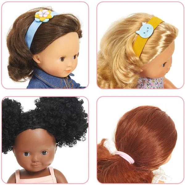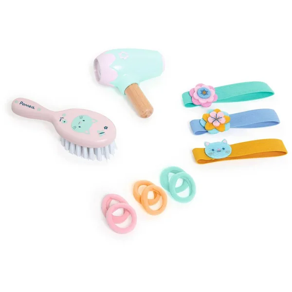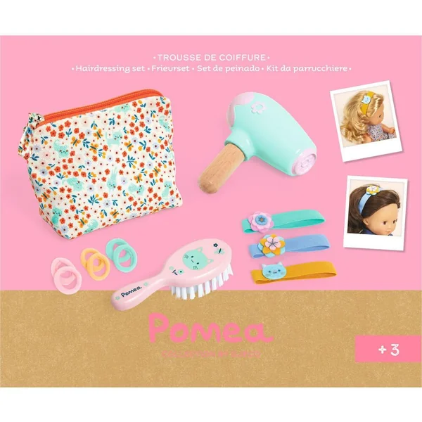Avec sa jolie trousse bien garnie, l’enfant s’improvise apprenti coiffeur et imagine une multitude de coiffures sur sa poupée. Après avoir fait semblant de sécher les cheveux de sa poupée, la brosse en bois avec des fibres souples démêle et fait briller la chevelure de la poupée. Il est temps de passer à la coiffure, mais que choisir ? 3 bandeaux trop mignons avec le petit chat, les fleurs se positionnent facilement sur la tête de la poupée, 6 élastiques en mousse : idéal pour faire des couettes.