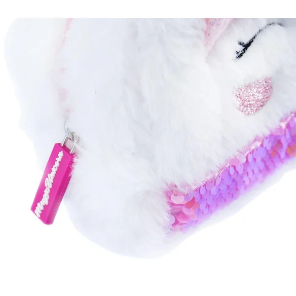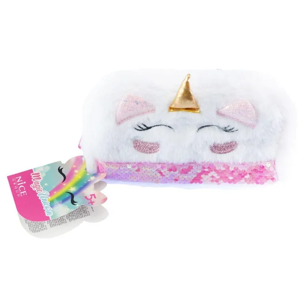 Étui en fourrure joyeux à emporter toujours avec vous. La décoration sur le thème de la licorne est complétée par une bande de paillettes scintillantes réversibles. Fermeture zippée.
