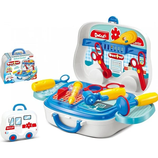 Super ensemble de docteur à l’intérieur d’une mallette en forme de voiture, avec laquelle on peut rouler comme avec une vraie voiture.