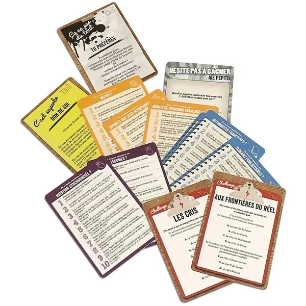 Auto-évalue tes connaissances de 1 à 10 sur des sujets originaux, classiques, intéressants ou farfelus ! Par équipe de 2 ou 16 joueurs, choisis ton pion à mettre sur le plateau (avec ce que tu trouves sous la main, pas trop volumineux sinon ça risque de poser des problèmes de lecture !), puis estime ta connaissace du thème donné par tes adversaires sur une échelle de 1 à 10. En fonction du chiffre donné la question sera plus ou moins difficile. A chaque équipe de jauger sa réponse pour sortir vainqueur ! 540 Cartes.