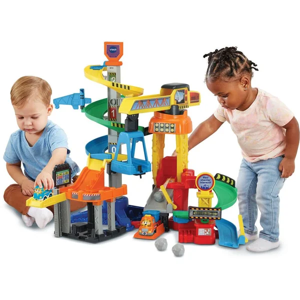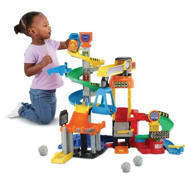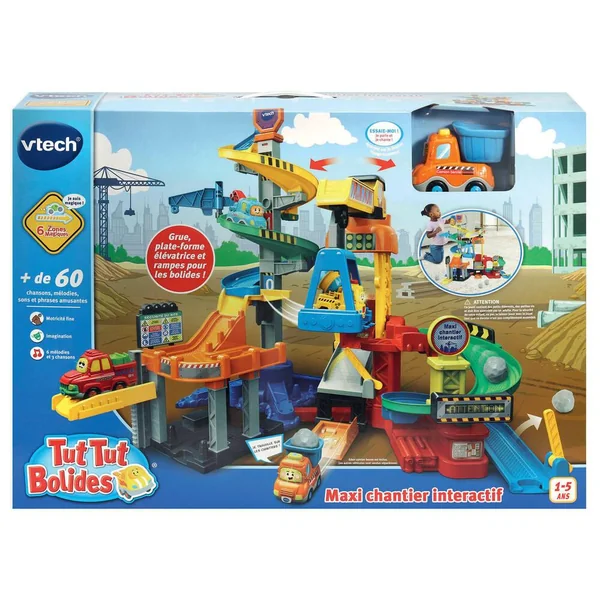 Un super chantier de construction avec grue rotative et un véhicule électronique inclus pour créer la prochaine tour de Tut Tut Land. C’est l’heure des constructions avec le Maxi chantier interactif ! Tous les Tut Tut Bolides sont de sortie pour charrier la terre, évacuer les gravas et préparer le béton. Après avoir transporté les pierres tout en haut de l’échafaudage triple spirale, les bolides redescendent et prennent place sur la grue pour accéder à la seconde partie du chantier. Une fois la journée terminée, il n’y a plus qu’à évacuer les gravas dans le camion benne grâce au tapis roulant. 6 Zones Magiques qui déclenchent des chansons et des sons amusants lorsqu’un bolide roule dessus, compatibles avec l’ensemble des Tut Tut Bolides. De nombreuses zones de jeu et de manipulations : une plate-forme élévatrice, une zone de travail, des barrières, drapeaux et panneaux à faire tourner, 3 pierres incluses – 1 véhicule électronique inclus « Eden Camion benne » avec plus de 60 chansons, mélodies, sons et phrases. Compatible avec tous les véhicules et les univers de jeu Tut Tut Bolides. Véhicule avec arrêt automatique. Pile de démonstration fournie