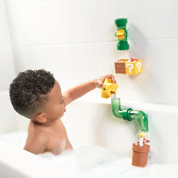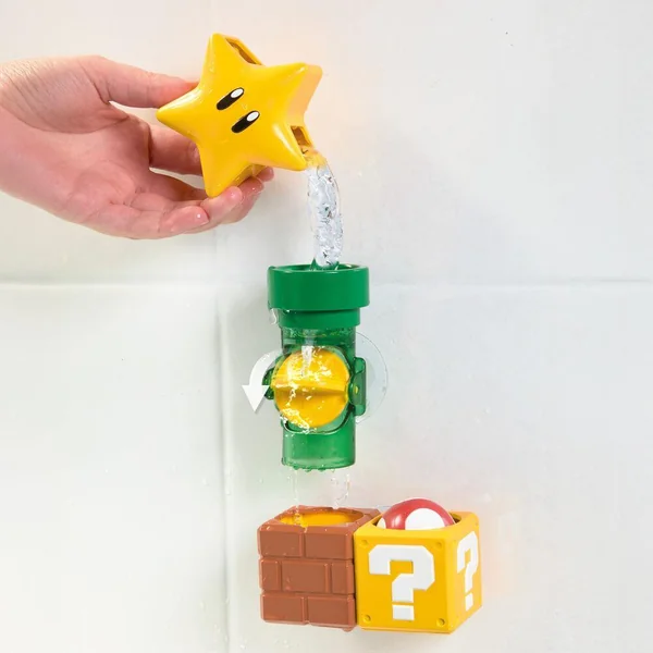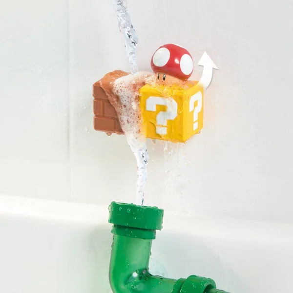 Construis ton circuit de bain Super Mario avec trois tuyaux, une tour, un bloc. Lorsque le château se remplit d’eau, Mario flotte jusqu’en haut. L’eau est ensuite libérée par le bas, permettant à Mario de redescendre. Le Super Champignon flotte jusqu’en haut du bloc ‘?’ une fois rempli d’eau..