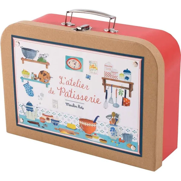 Tout l’univers de l’atelier pâtisserie contenu dans une valise !Pour faire comme les grands : de vrais ustensiles de cuisine en bois ou en métal, des moules à gâteaux, des emporte – pièces, un fouet et un recueil de 9 recettes sucrées…