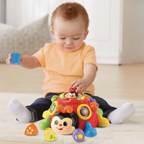 4 formes colorées à encastrer pour apprendre les formes, les chiffres, les couleurs et le vocabulaire de la nature. Bébé coccinelle sur le dos de sa maman permet d’éjecter toutes les formes lorsqu’on appuie sur sa tête. 2 modes de jeu : Découverte et Musical. Bébé peut également promener sa coccinelle grâce au cordon au rythme de mélodies entraînantes ! Boutons lumineux et interactifs à manipuler, pour le plus grand plaisir de Bébé. Une chenille et un papillon à manipuler. Age : de 12 à 36 mois.