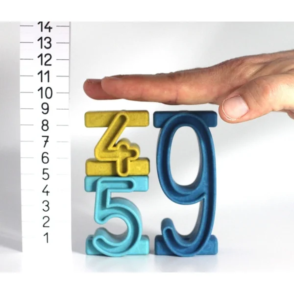 Le chiffre 1 mesure 1 cm de haut, le chiffre 2 mesure 2 cm de haut, et ainsi de suite. Plus le chiffre est élevé, plus sa valeur numérique est grande. Les enfants apprendront ainsi de manière ludique à classer les chiffres par taille, à les comparer, à les additionner et à les soustraire. Les chiffres sont fabriqués en matériau solide 100% recyclé avec certification PEFC, qui est recyclable à nouveau après utilisation. Tous les chiffres mesurent 4 cm de large et 3 cm de profondeur. Emballés dans une boîte en carton avec une règle de contrôle et un mode d’emploi.