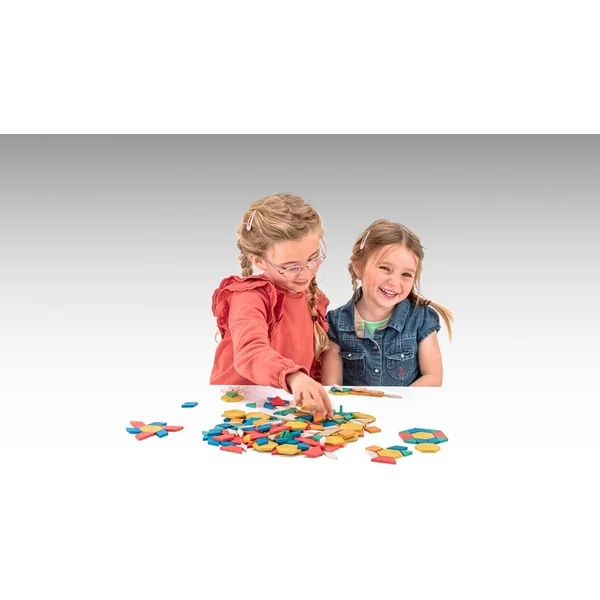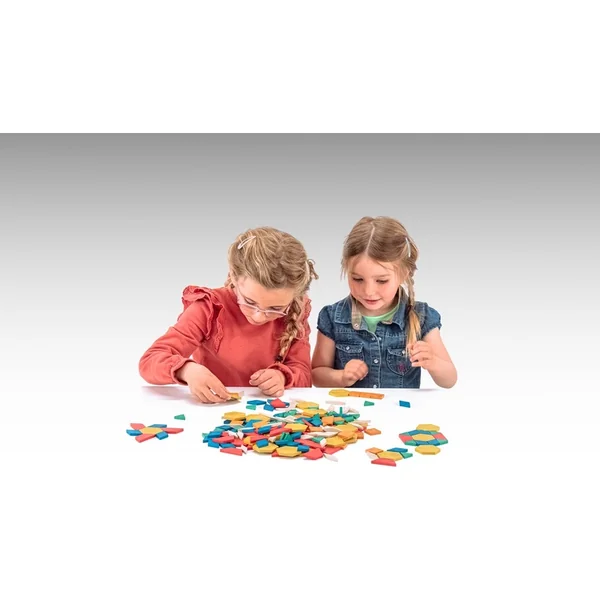 250 pièces colorées en 6 formes géométriques, qui servent à jouer et à apprendre sur les formes et les couleurs. Libérez votre créativité et assemblez des images en 3D. Décorations, animaux, chiffres, ornements ou mandalas. L’enfant apprend à découvrir la symétrie et à nommer différentes formes et surfaces.