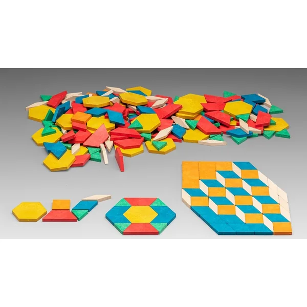 - 25 hexagones jaunes, 25 carrés orange, 50 trapèzes rouges, 50 triangles verts, 50 parallélogrammes bleus et 50 losanges beige.