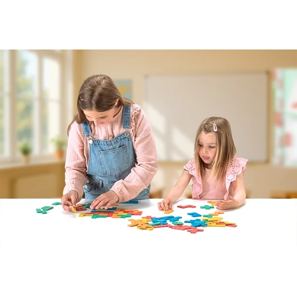 Avec 60 pièces de pentomino dans 5 couleurs (12 pentominos de chaque couleur), les enfants peuvent créer différentes images selon leur propre imagination ou remplir des images où seul le contour est indiqué. Grâce au jeu, ils acquièrent leurs premières expériences en géométrie, découvrent ce qu’est la surface et le périmètre, et apprennent quels formes sont symétriques et lesquelles ne le sont pas.