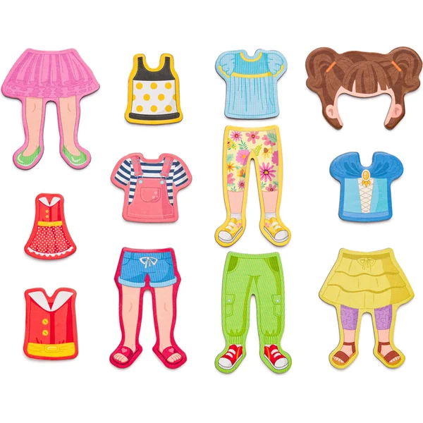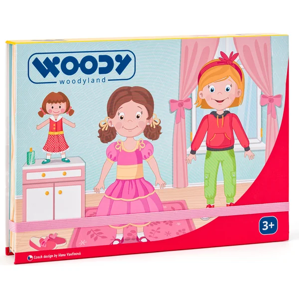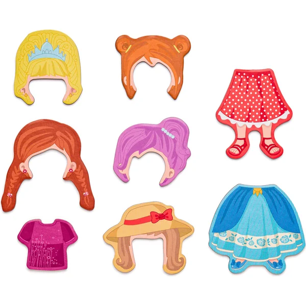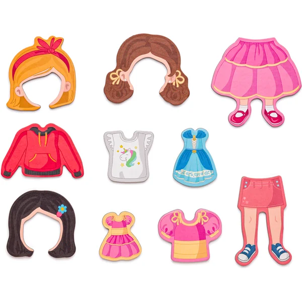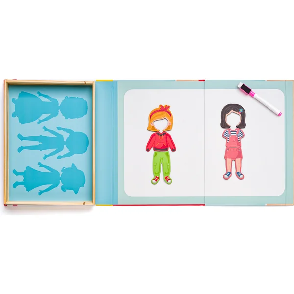 Ouvre la boîte en bois pleine de vêtements magnétiques et crée des tenues parfaites pour deux petites filles sur un tableau magnétique. Combine des t-shirts, des jupes, des pantalons, des robes et des coiffures – et n’oublie pas d’habiller aussi leur poupée ! Inspire-toi des cartes fournies avec des conseils de mode.