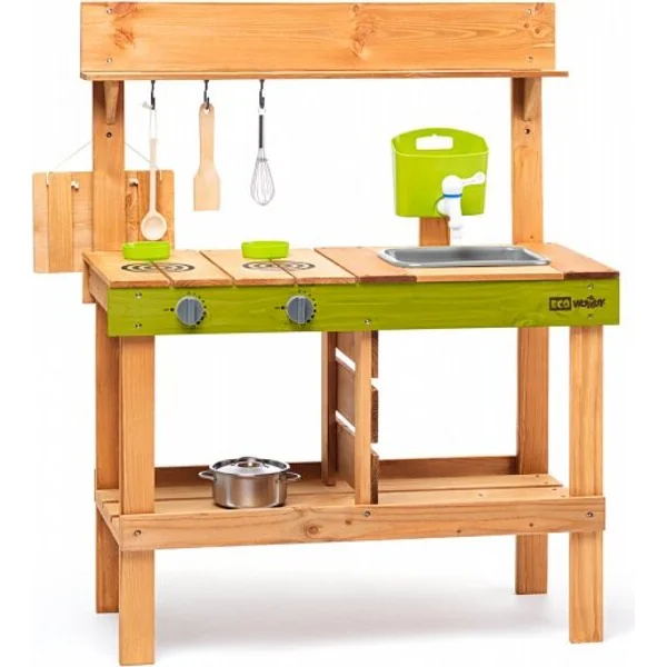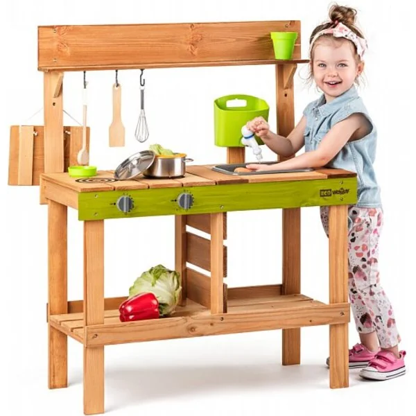 D’un côté, une petite cuisine avec deux plaques de cuisson, de l’autre, un comptoir de service. La cuisine est équipée d’un réservoir d’eau, grâce auquel l’enfant peut réellement laver des fruits, des légumes, mais aussi de la vaisselle et des ustensiles qui font partie de ce produit.