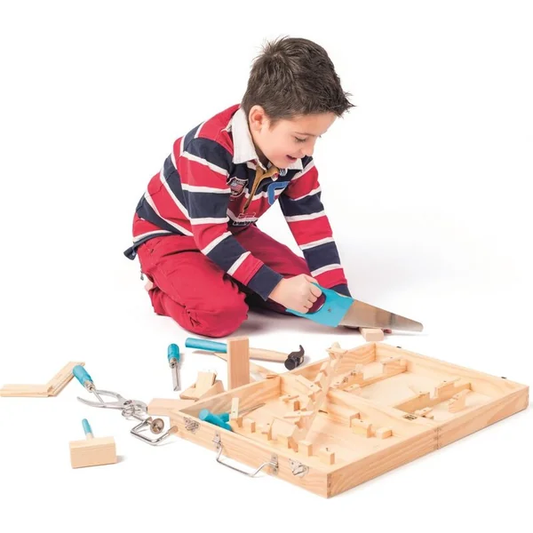 Des outils solides dans une boîte en bois de couleur naturelle offrent aux petits bricoleurs 14 pièces d’outils ! Tout est pratiquement rangé dans une mallette fermable et grâce à la poignée sur le dessus, le petit bricoleur peut emporter les outils partout avec lui.